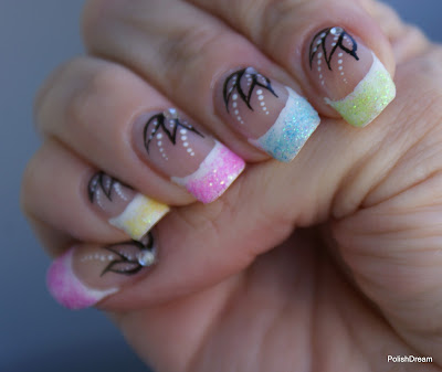 Jäi ilmeisesti nämä kynnet *klik* takaraivoon kummittelemaan, kun ranskiksen tehtyäni tuli vastustamaton hinku laittaa eriväriset kimallukset joka kynteen =)